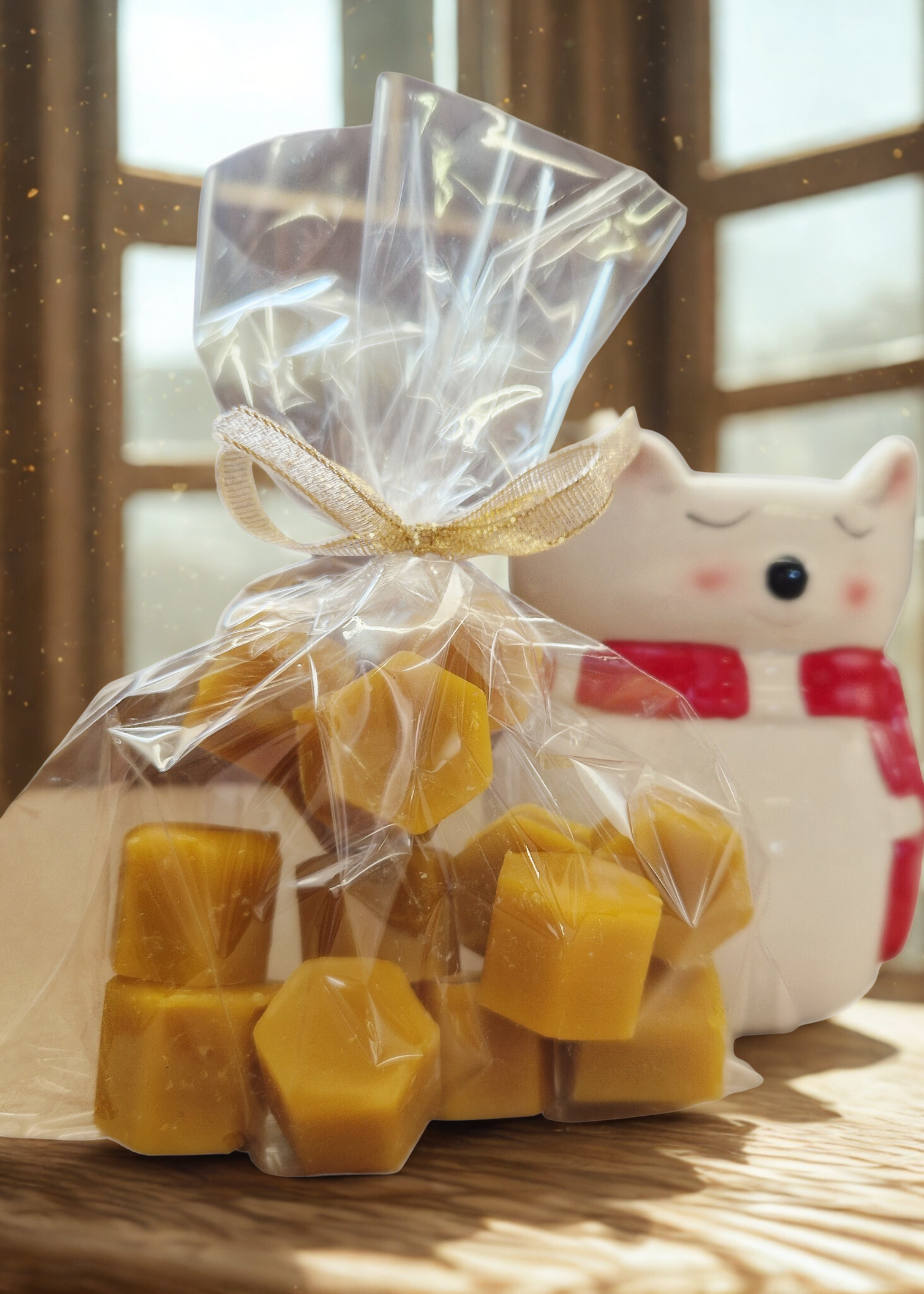 Naturalne kosteczki z wosku pszczelego w kształcie małych heksagonów. Idealne do kominków zapachowych – dla subtelnego, prawdziwego aromatu wosku, bez syntetycznych dodatków.