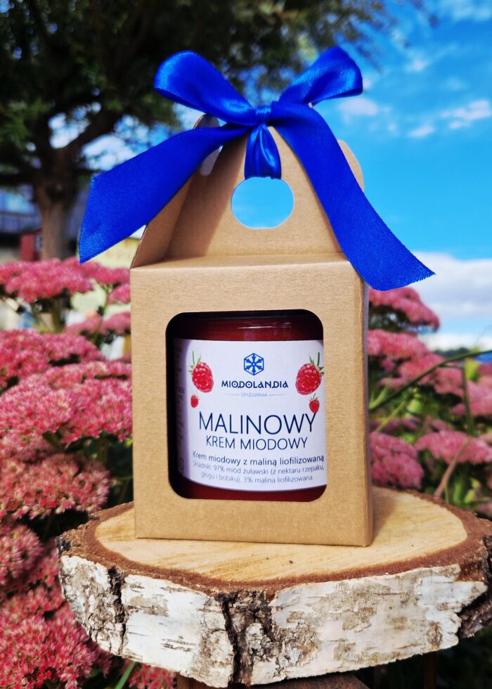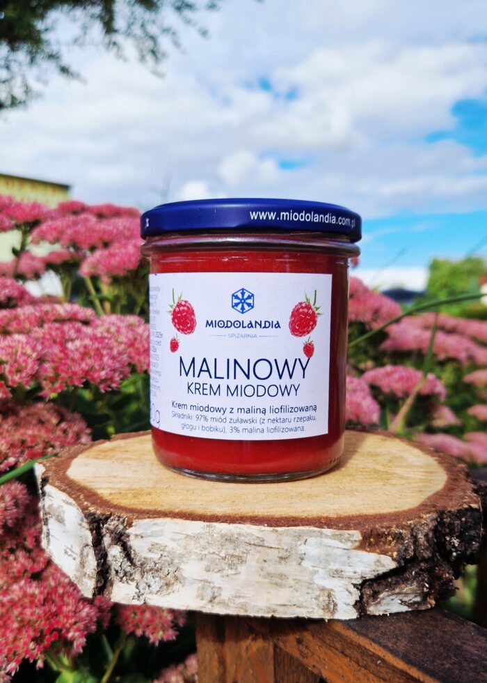 Malinowy krem miodowy to wyjątkowy produkt ze Spiżarni Miodolandia, którego producentem jest Mirella Browarczyk. Malinowy krem miodowy powstaje dzięki ciężkiej pracy pszczół zbierających nektar z rzepaku, głogu i bobiku, a następnie łączonego z liofilizowanymi malinami. Co więcej, każda z tych roślin posiada unikalne właściwości zdrowotne, dlatego ich połączenie w tym kremie miodowym stwarza potężny zastrzyk energii i witalności dla organizmu. Produkt jest w 97% miodem żuławskim, a pozostałe 3% stanowią maliny liofilizowane, co sprawia, że smak jest zarówno naturalny, jak i owocowo-słodki.