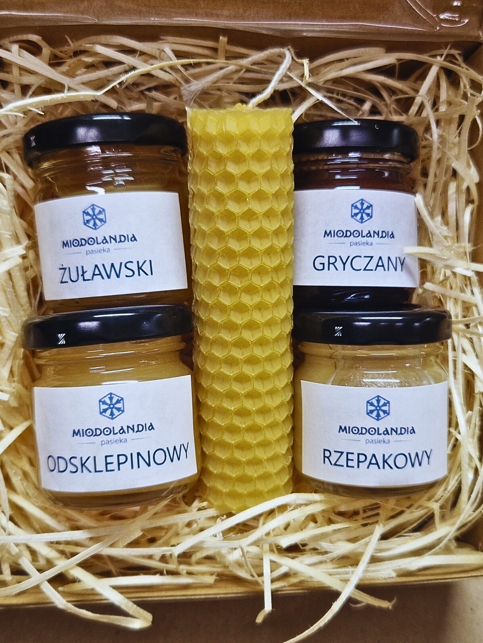 Aby zapewnić różnorodność smaków i cennych właściwości, przygotowaliśmy cztery wyjątkowe miody w eleganckich słoiczkach po 45 g każdy oraz świecę z wosku pszczelego: