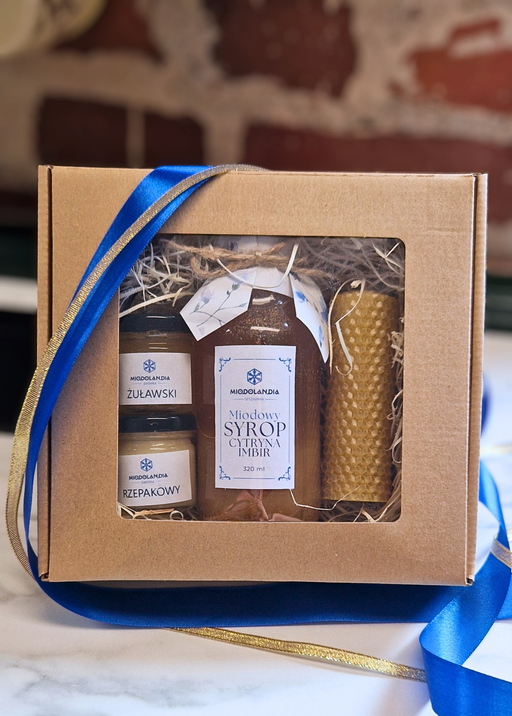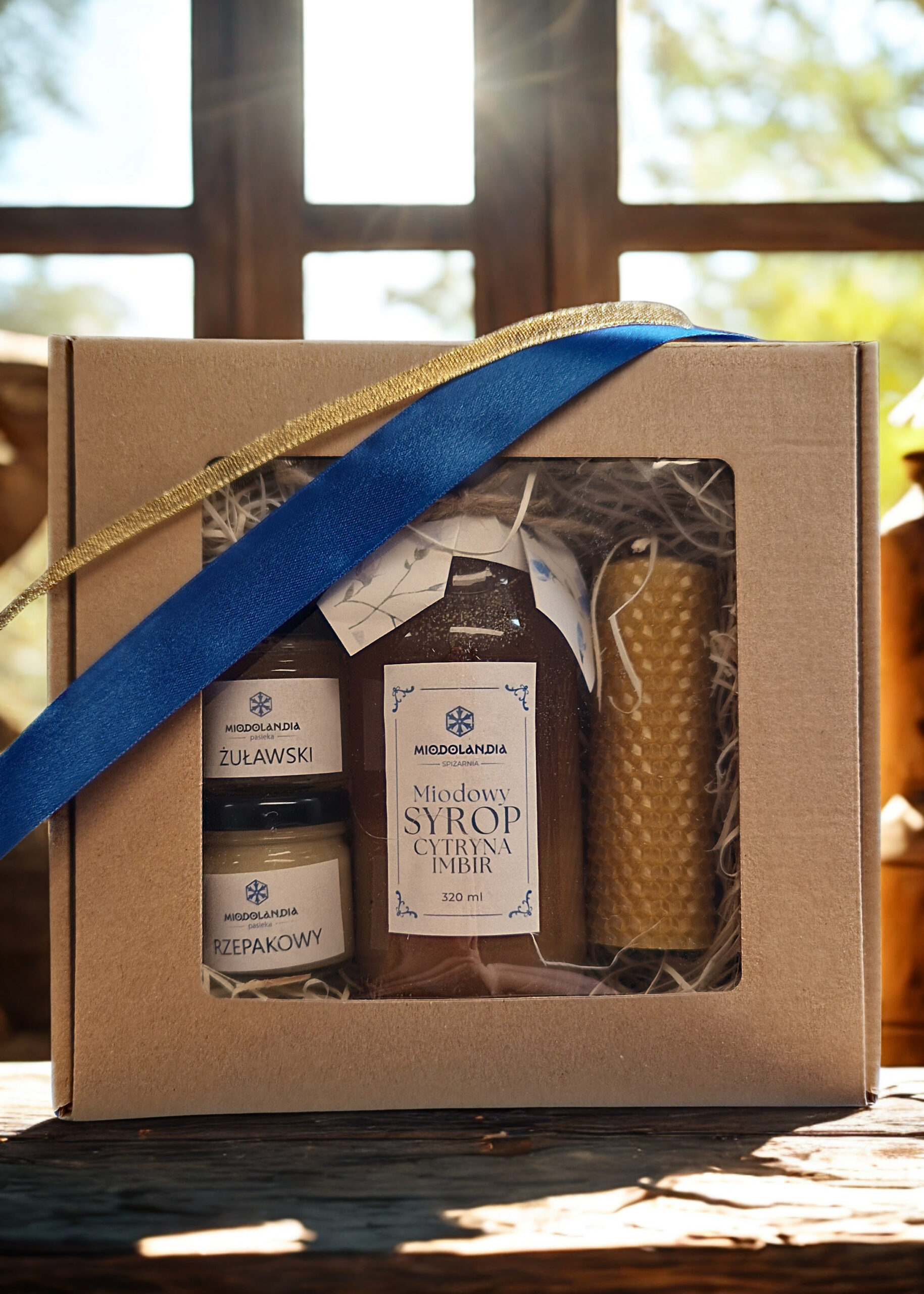Ten zestaw został stworzony z myślą o osobach, które lubią otulić się ciepłem i naturalnymi smakami. Zawiera dwa klasyczne miody w wersji mini: żuławski oraz kremowany rzepakowy, każdy po 45 g. W środku znajduje się także ręcznie odlana świeca z wosku pszczelego, tworząca nastrojowy, przytulny klimat. Całość dopełnia miodowy syrop cytryna imbir, idealny do herbaty, grzańców i zimowych napojów. Ten zestaw świetnie sprawdzi się jako drobny, sezonowy prezent o naturalnym, ciepłym charakterze.