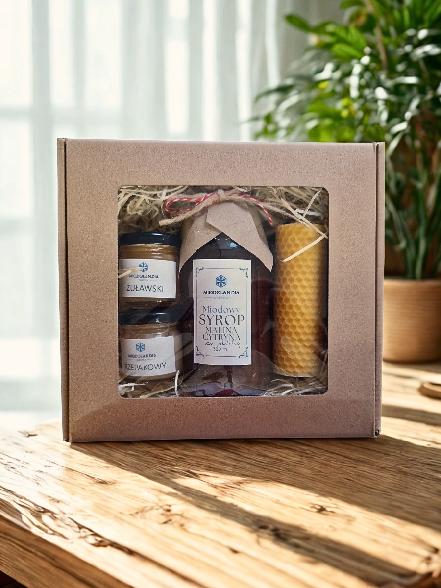 Miód żuławski 45 g + Miód rzepakowy kremowany 45 g + Świeca z wosku 50 g + Miodowy syrop malinowy 320ml
