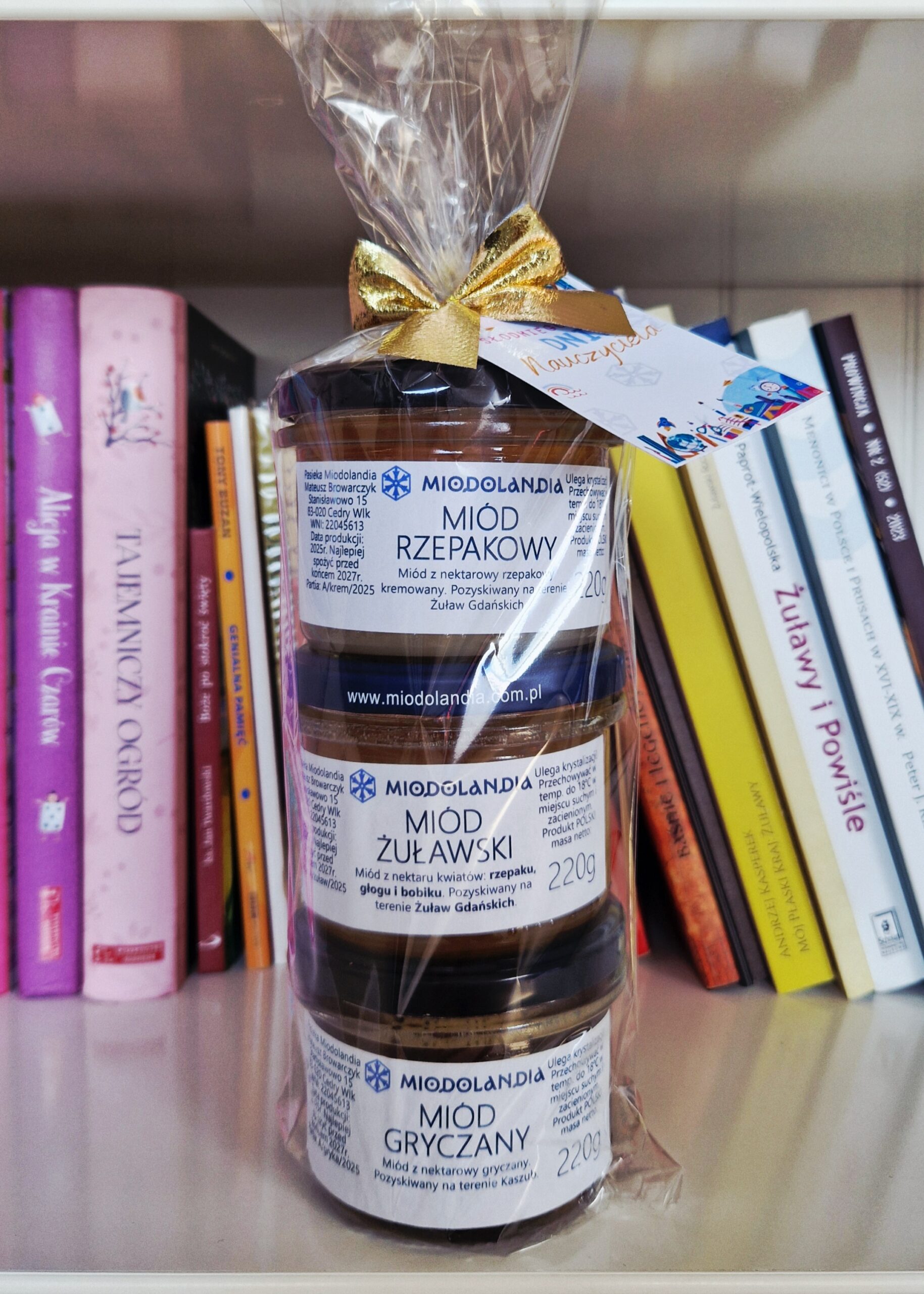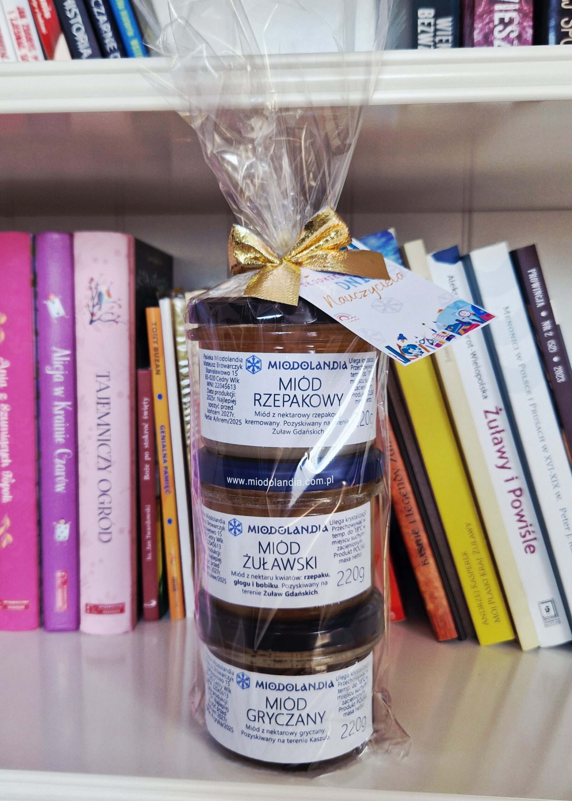 W zestawie znajdują się trzy słoiki po 220g, z miodami, które różnią się smakiem i właściwościami, ale jednocześnie doskonale się uzupełniają: